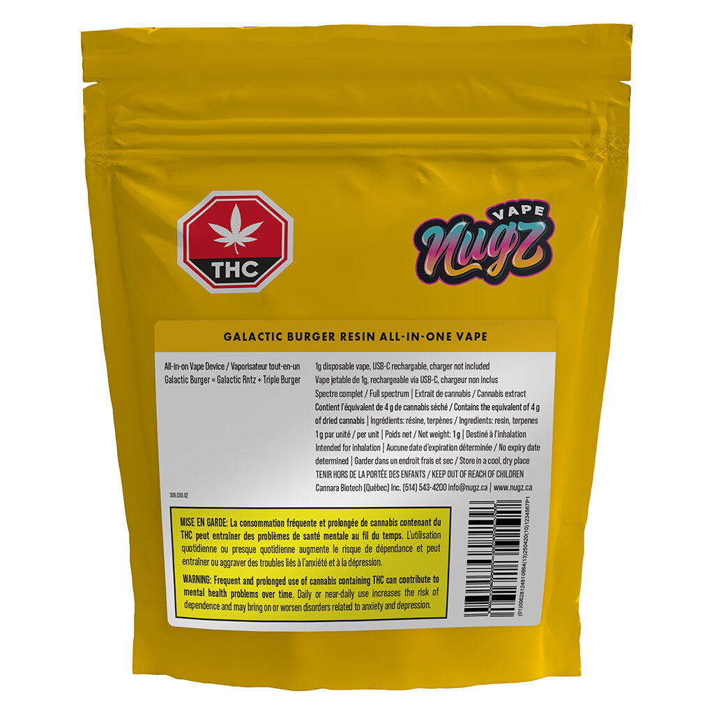 Ever step out for a smoke, only to end up searching for a lighter? Say goodbye to the hassle with the Nugz Galactic Burger Cured Resin All-in-One Vape. Packed with 1g of our finest cured resin, this rechargeable vape is crafted for consistent clouds + a full-flavour experience. Inhale-activated for seamless use, just press the side button 5 times to turn on/off and 2 times for pre-heat! Featuring a ceramic heating element, USB-C recharge-ability, and preloaded to go right out of the box. No extras needed, just pure satisfaction from start to finish. Nugz Galactic Burger Cured Resin All-in-One Vape — everything you need in one device.